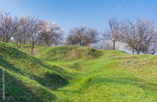 serenity, spring, landscape, fruit farm, scenery, view, hill, slope, ukraine, season, seasonal, grass, herb, flowering, fruit, apricot, blue, cloudless, sky, insouciance, idylli, nobody, hillock, hillock, foreground, background, quiet, silence, calm, peace, tranquil, picturesque, scenic, scene, fresh, green