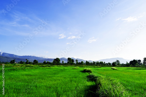 landscape with green field and blue sky rice