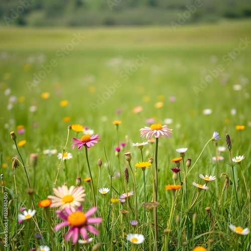 Landscape with meadow grass and wildflowers
