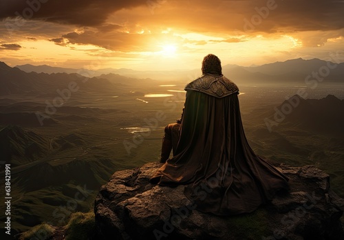Landscape with medieval warrior on the top of the mountain, sunset in the background. Generative AI