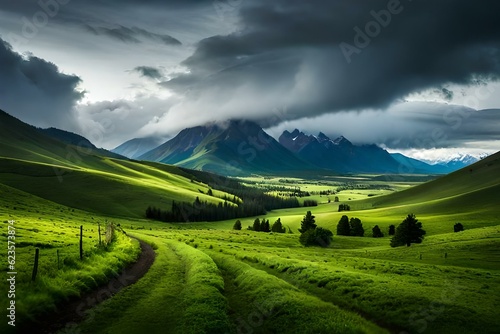 landscape, sky, grass, nature, mountain, field, green, summer, meadow, cloud, tree, cloud, hill, countryside, forest, rural, mountain, spring, road, view, sun, farm, land, vale, horizon