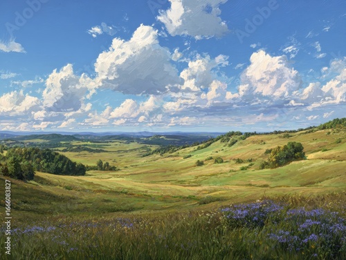 Landscape with Rolling Hills and Wildflowers Under the Blue Sky. --ar 4:3 --v 7 Job ID: 5f5b54a3-627f-4b7c-aaaa-374060d463d1