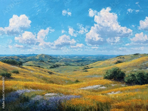 Landscape with Rolling Hills and Wildflowers Under the Blue Sky. --ar 4:3 --v 7 Job ID: d8dda6a2-6bfe-4135-b3ee-b4a6278a6f69