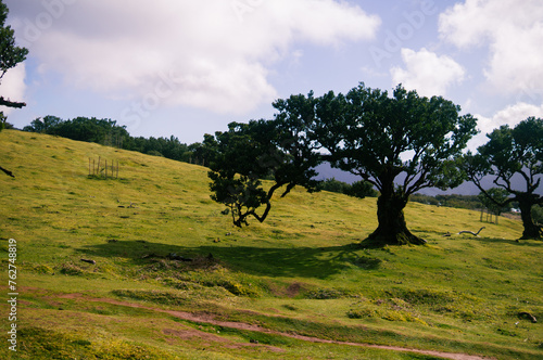 tree, landscape, nature, grass, green, cloud, tree, hill, horizon