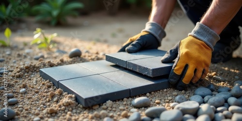landscaping, ground cover, garden, dirtied, men at work, hand, glove, stone, pebble, construction, installation, pathway, patio, driveway, improvement, home, backyard, upgrade, renovation, project, exterior, detail