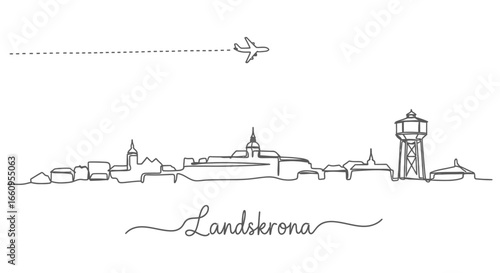 sweden, skyline, vector, line art, travel, tour tourism, city, architecture, building, city landscape, landmark, minimal, outline, drawing, illustration, design, scandinavian, european, scandinavia, swedish, plane, aeroplane, aerodrome, flying, journey, vacation, destination, holiday, trip, landscape, urban, modern, minimalist, simple, graphic, icon, symbol, isolated, white background, monochrome, black-and-white, travel destination