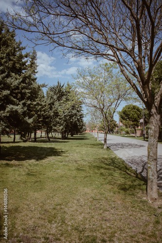 Lanscape of trees at park and we can see the sky blue with clouds