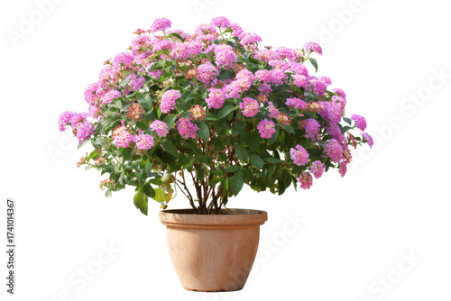 lantana, shrub, pot, terracotta, plant, pink, flower, cluster, foliage, green, growth, compact, garden, home, decor, banner, catalog, studio, isolated, white, background, potted, ornamental, container, flora, botany, horticulture, display, nature, commerce, marketing, product, lifestyle, agriculture, arrangement, delicate, vibrant, glossy, texture