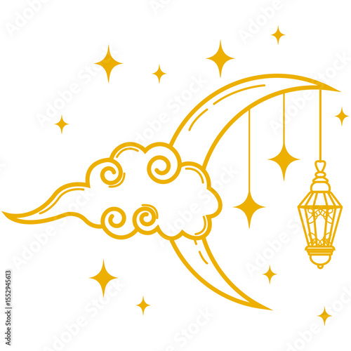 Lantern With Crescent Moon and Cloud. Composition with crescent moon lantern, cloud and stars for islamic holy month decoration. Decorative 3d elements for Muslim holidays