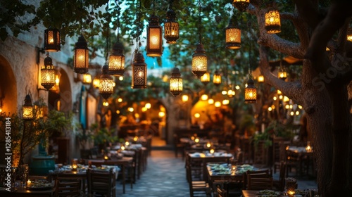 Lanterns hanging from trees in a courtyard