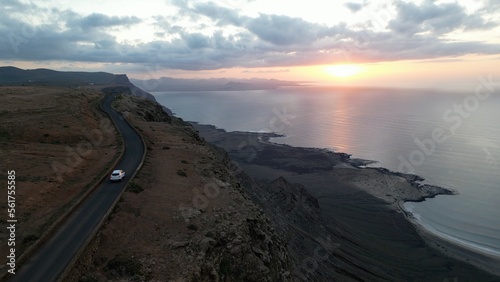 Lanzarote, Canary islands , Spain, Europe - Amazing street car road by the sea during the sunset in Mirador del Rio in north of Lanzarote biosfera reserve - journey and tourist attraction - Graciosa