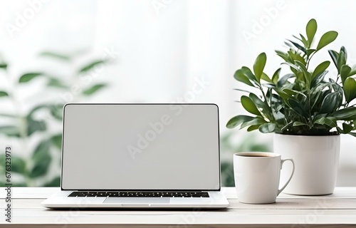tablet, laptop, cup, keyboard, table, wooden, hot drink, mug, leaf, plant, space, office, copy, concept, equipment, design, modern, computer, creative, workspace, desktop, document, technology, workplace, desk, blank, business, view, work, pot