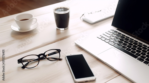 laptop computer sitting on a wooden table, devices and tools, smartphone. Generative Ai