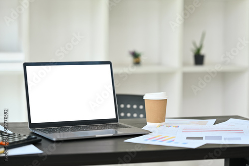 Laptop computer with white screen, document and office supplies on black wooden work desk