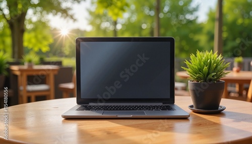 Laptop mockup with plant on wooden table in sunny outdoor café setting