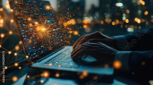 computer, laptop, technology, business, work, desk, office, night, city, skyline, city landscape, light, dark, cyberspace, datum, information, digital, networking, communication, coding, programming, finance, investment, success, achievement