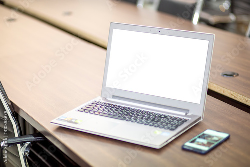 Laptop on wooden table near the window at the office with white screen. White notebook on the table in the building with clipping path on white screen.