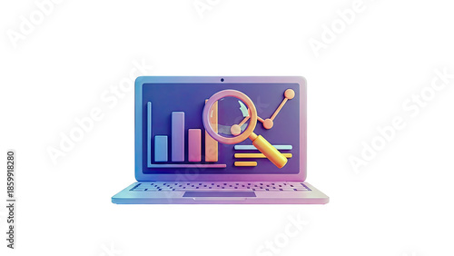 statistic, laptop, magnifying glass, chart, graph, research, business, digital, technology, illustration, three-dimensional, computer, report, performance, insight, information, strategy, growth, trend, marketing, finance, investment, economy, planning, optimization, web, online, dashboard, presentation