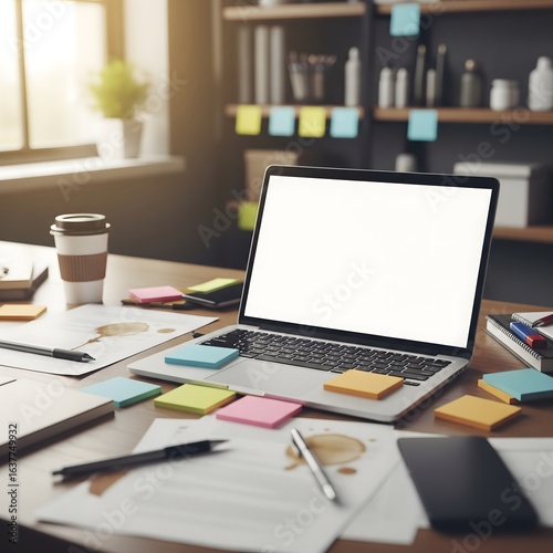 Laptop with blank screen on a cluttered office desk with sticky notes