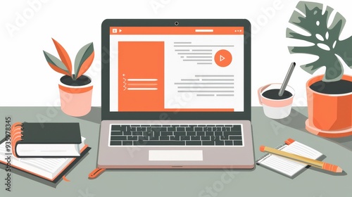 laptop, computer, notebook, book, plant, plant, houseplant, green, orange, desk, table, workspace, home office, study, work, learning, education, digital, technology, modern, minimal, simple, illustration, vector, graphic, design, workplace, business, screen, keyboard, cyberspace, monitor, office, web, online, network, mobile, three-dimensional, concept, icon, display, object, communication, electronic, portable