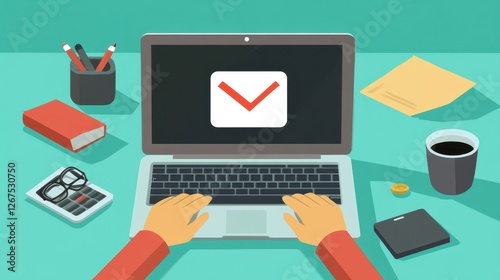 electronic mail, laptop, notification, workspace, hot drink, book, desk, pen, goggles, stationery, paper, technology, writing, communication, smartphone, typing, hand, casual attire, modern, office, business, study, home, digital, online, contraption, creativity, media, alert, message, network, design, illustration, working, productivity, arrangement, focused, user, connection, correspondence, screen, lifestyle, organisation, interaction, modernity, convenience