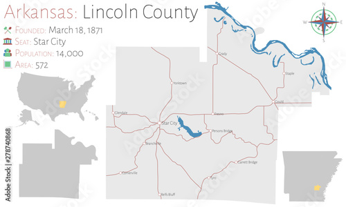 lincoln, star, arkansas, county, map, america, american, us, city, city, lake, road, expressway, highway, signs, signs, population, citizen, federal, state, nation, vector, illustration, infographic, education, cartography, geography, colours, colourful, white, yellow, red, blue, green, grey