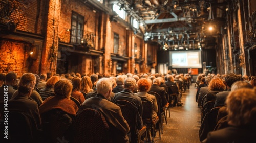 conference, audience, presentation, lecture, meeting, large, group, brick, building, rustic, hall, indoor, event, gathering, people, seated, listening, speaker, warm, lighting, back, view, crowd, seminar, workshop, congress, convention, symposium, assembly, room, corporate, business, public, speaking, red, industrial, interior, architecture, venue, space, row, of, seat, focused, attentive