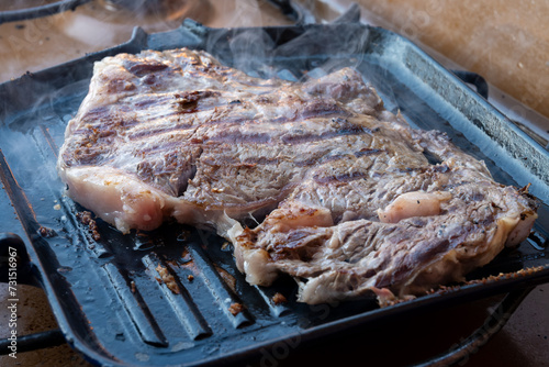 Large beef rib eye steak grilled on gas stove grill in small village restaurant in Italy