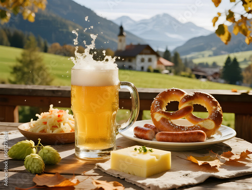 beer, mug, glasses, drink, ales, foam, splash, pretzel, sausage, cheese, meal, food, plate, photorealistic, still life, composition, detail, sharpened, rustic, authentic, traditional, delicious, gold, yellow, white, brown, green, mountain, alps, landscape, holiday, celebration, festive, oktoberfest, german, bavarian, heritage, tradition, refreshment, alcohol, lifestyle, scenery, seasonal, cosy, epicure, favor, lager