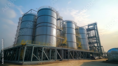 Large biofuel storage tanks, modern setup, eco-friendly fuel processing facility