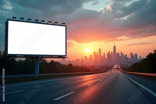 billboard, highway, blank, advertising, city landscape, sunset, urban, transportation, road, skyline, structure, advertisement, design, template, commercial, panel, signs, empty, display, communication, marketing, roadside, perspective, destination, journey, travel, avenue, signs, mock, copy space, presentation, graphic, layout, promotion, announce