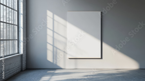 large, blank poster hangs on wall in empty room, bathed in natural light streaming through window. minimalist setting creates serene atmosphere