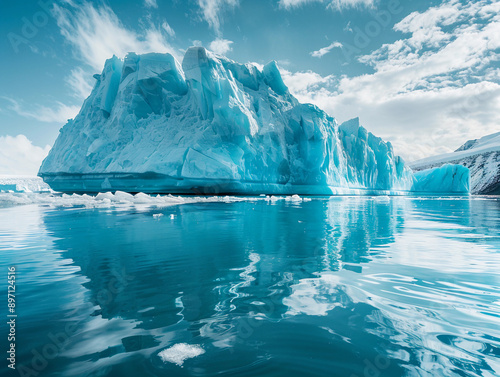 iceberg, ice, glacier, water, ocean, sea, blue, sky, cloud, calm, sunny, day, landscape, nature, arctic, antarctic, cold, glacé, white, natural wonder, scenic, tranquil, peaceful, serenity, beauty, travel, adventure, exploration, climate change, global warming, environmental, conservation, melting, geology, geography, scenery