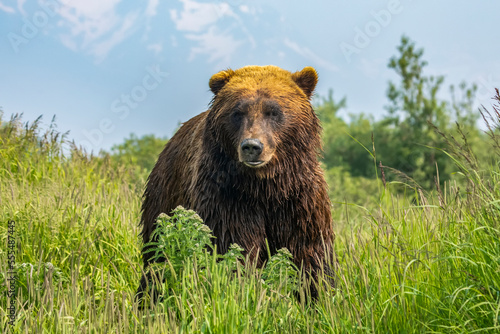 horizontal, field, outdoors, day, plant, closeup, lush, portrait, tour tourism, standing, bear, staring, alaska, alaskan, eye contact, full-length, captivity, boar, animal, wildlife, green, grass, destination, travel, mountain, one animal, color image, brown bear, tourist attraction, travel destination, no people, front view