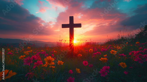 Large christian cross standing on a hill at sunset, surrounded by flowers