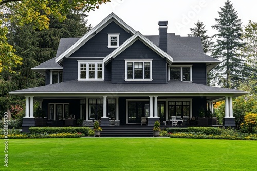 Large dark-grey house with white trim, spacious porch, and manicured lawn.