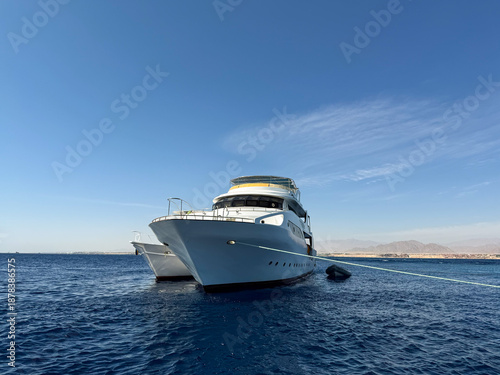Large diving yacht anchored in the Red Sea during a tourist snorkeling and diving excursion
