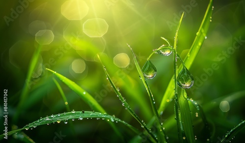 Large droplets of fresh morning dew on green grass in spring and summer. A beautiful artistic representation of beauty and purity.