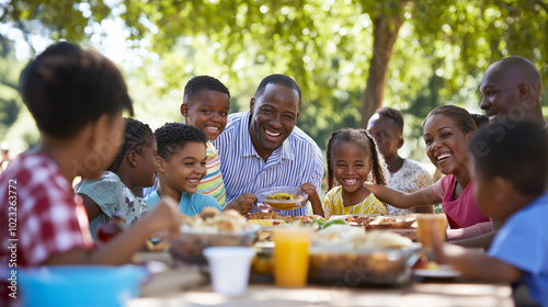 Large Family Enjoying a Reunion Picnic in a Sunny Park