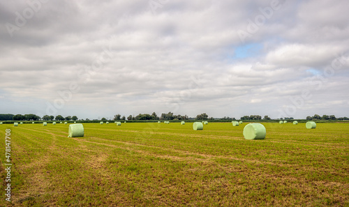 Large field with scattered hay bales packed in green plastic film. The photo was taken on a cloudy day in the summer season in the Dutch province of North Brabant.