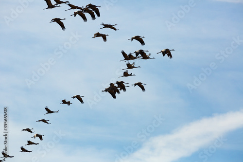 Large flock of cranes flying in blue spring sky. Bird migration time..