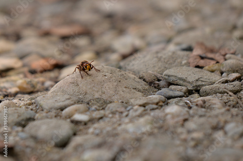 large forest wasp walking on the ground. Vespa crabro a dangerous venomous insect