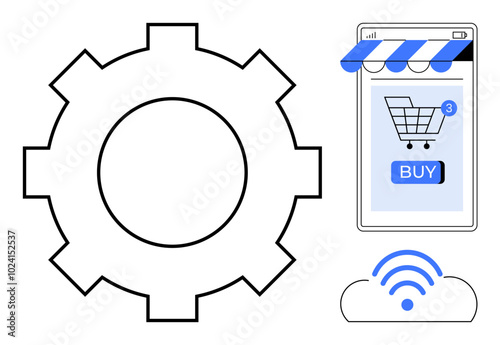 Large gear beside a smartphone screen displaying an online shopping cart with buy button. Wireless symbol below. Ideal for e-commerce, automation, mobile shopping, technology, wireless communication