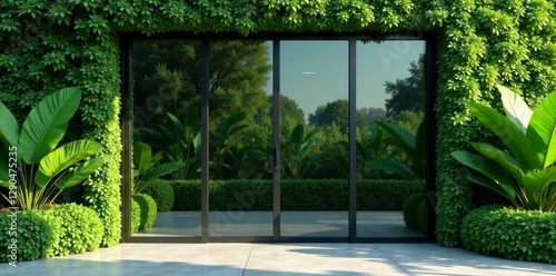 Large glass door, vibrant green wall, lush plants , building, tranquil