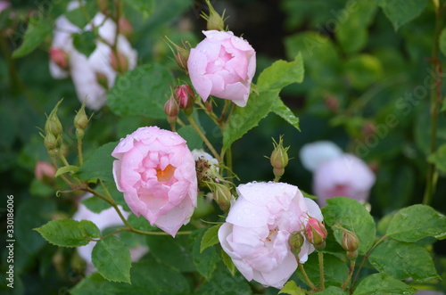 Large green bush with fresh delicate light pink roses in full bloom in a summer garden, in direct sunlight, beautiful outdoor floral background photographed with soft focus