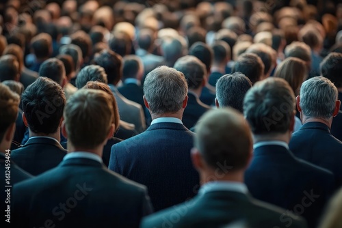 Large group of people dressed in formal business attire standing closely together viewed from behind in a professional gathering or conference setting