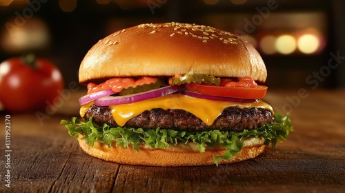 Large Homemade Cheeseburger with Fresh Vegetables and Egg