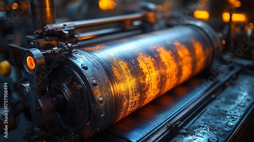 Large Industrial Printing Press Rolling Cylinder With Orange Light and Metallic Design