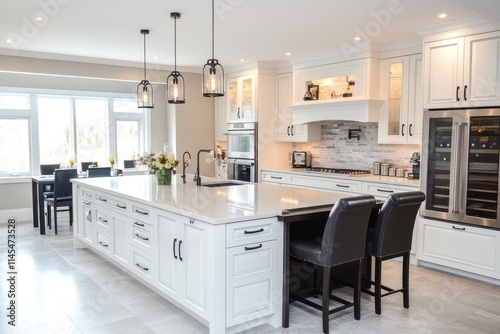kitchen, island, cabinet, countertop, flooring, lighting, pendant, light, white, modern, contemporary, luxury, home, interior, decor, style, elegant, roomy, bright, window, view, appliance, sink, faucet, backsplash, stone, grey, wine, refrigerator, chair, drawer, handle, farmhouse, classic, clean, minimalist, sophisticated, chic, comfortable, functional, beautiful, aesthetic, room, house, property, real estate, photo, stock