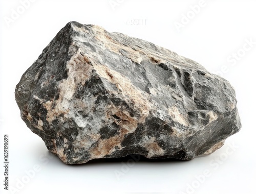 large natural rough stone rock with mixed dark gray and light tan coloration isolated on white background